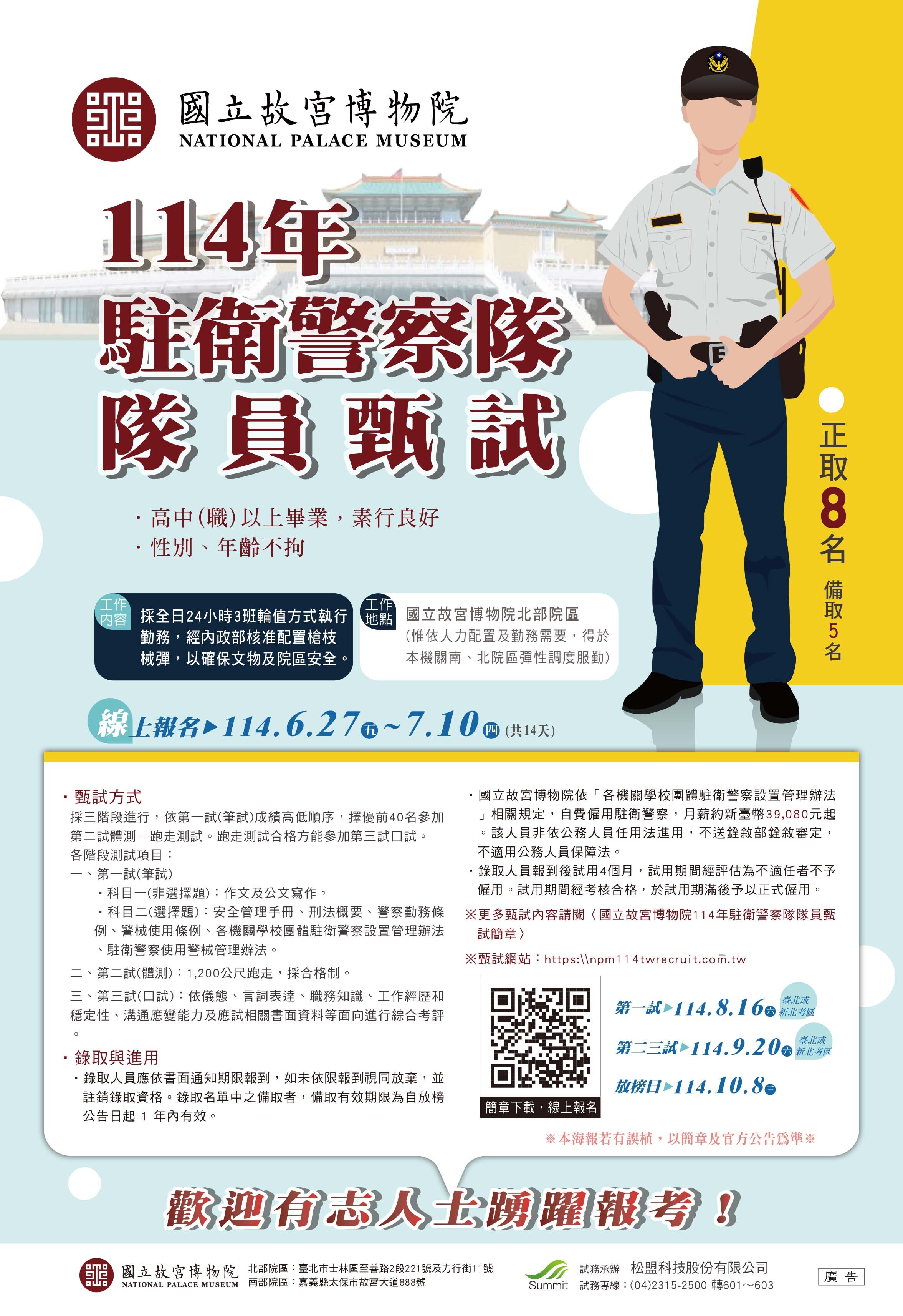 【公部門】「國立故宮博物院114年駐衛警察隊隊員甄試」簡章暨招考訊息
